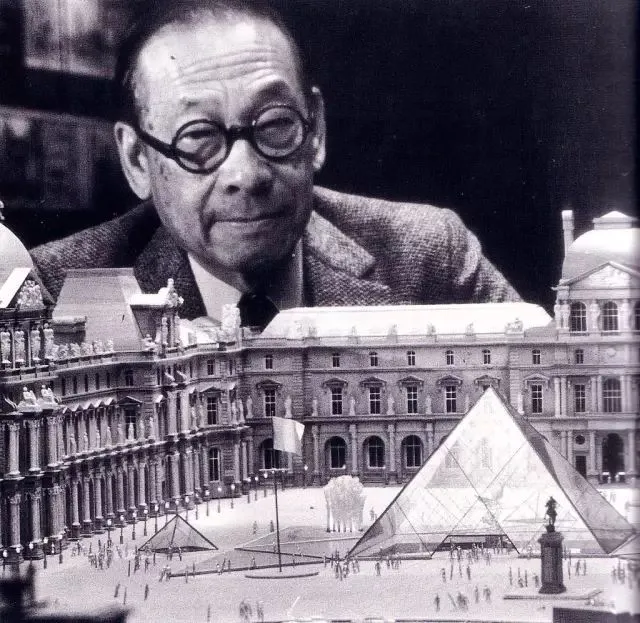 贝聿铭在卢浮宫金字塔模型前