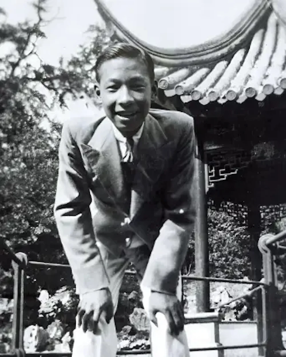 贝聿铭在苏州狮子林湖心亭的一座桥上,约1930年代。由贝考弗及合伙人事务所提供。