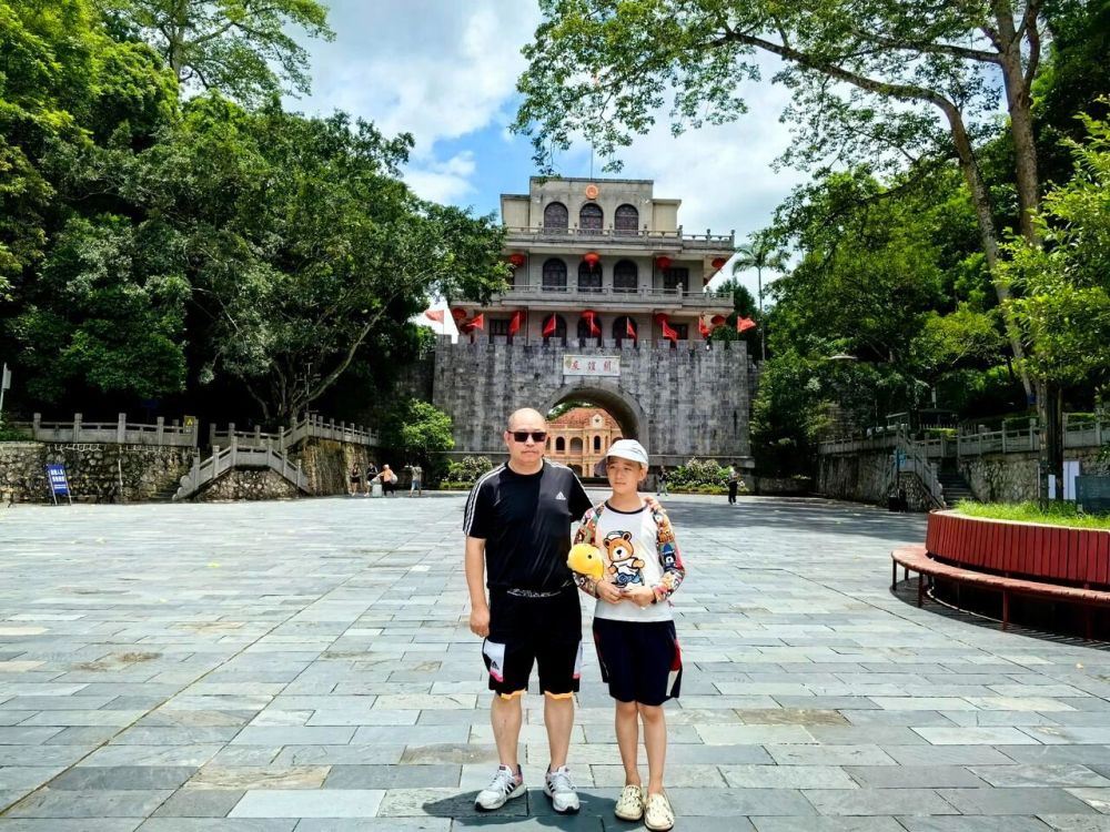 镇南关是华中大学等学校内迁的经行之地。作者寻访旧址后与儿子在此合影。(受访者供图)