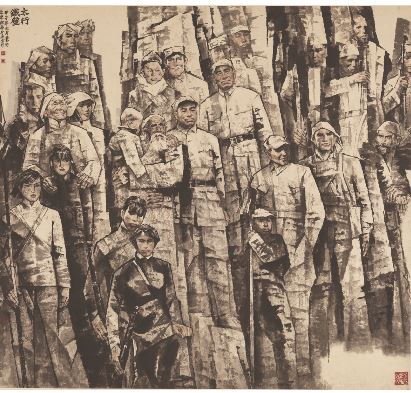 抗战主题美术创作的历程像一条始终涌动着时代主旋律的河流,对抗战历史不同侧面、不同角度的主题阐释,也无不是这一时代思想河流的映射。曾获第七届全国美展金奖的国画《玫瑰色的回忆》(1989),对奔赴延安的知识女性的描写充满了青涩与浪漫,这是延安版画中罕见呈现的情愫。对成长于和平年代的艺术家而言,这一题材创作带来的挑战,与其说是还原历史的困难,毋宁说是如何认识历史真实并确立正确历史观的大课题。从这个角度讲,抗战主题美术创作的代代接力,也表征着以美术创作对抗战历史的不断澄明以及从中不断获取和平发展启示的精神探求。抗战主题美术创作的持续与深入,正是以宏大叙事实现了为民族复兴不断续写恢宏巨构的历史使命。